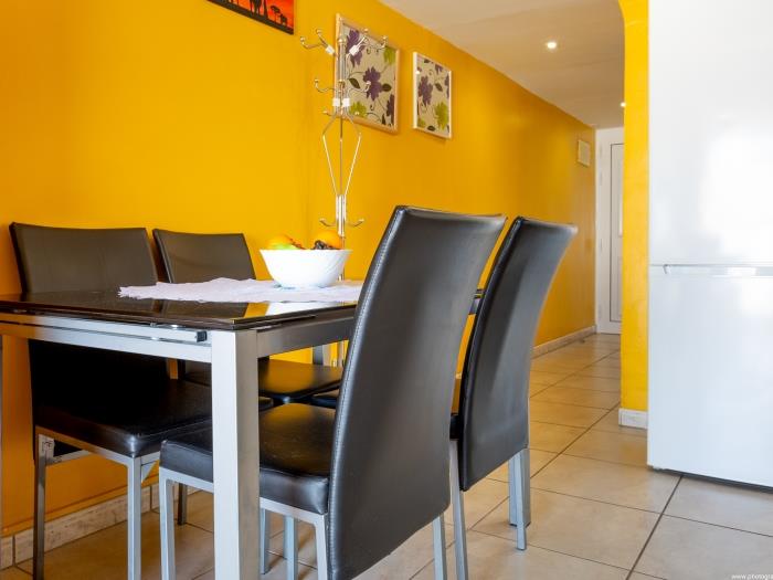 En la planta baja, encontrarás un luminoso salón-comedor con paredes pintadas en un vibrante tono amarillo, creando un ambiente alegre y acogedor. El salón está equipado con un cómodo sofá esquinero en tonos oscuros, decorado con cojines coloridos, y una mesa de centro perfecta para relajarse o disfrutar de una película en la televisión de pantalla plana. La cocina, integrada en este espacio, está completamente equipada con todos los electrodomésticos necesarios para preparar tus comidas favoritas, incluyendo una nevera, una pequeña isla y un comedor con sillas modernas de color negro.