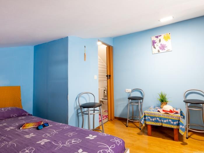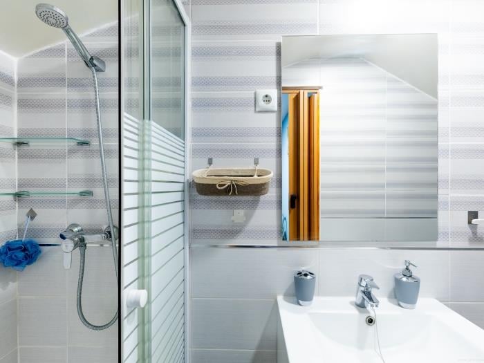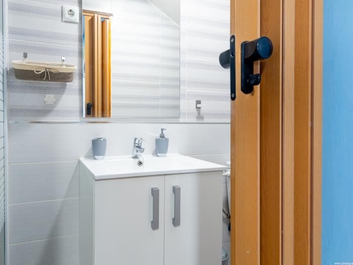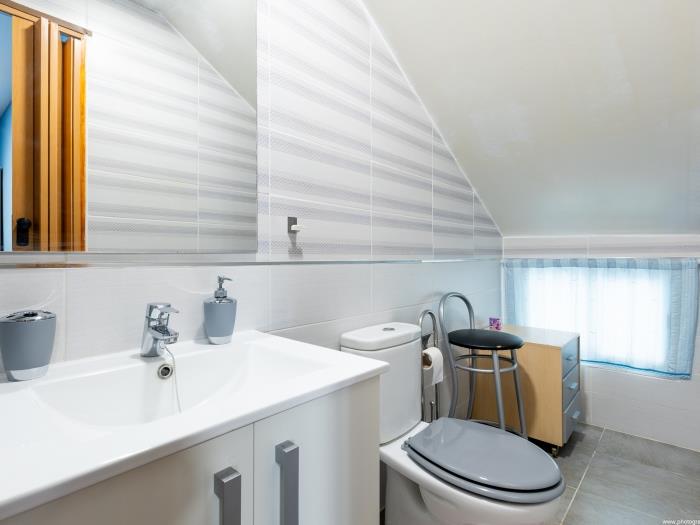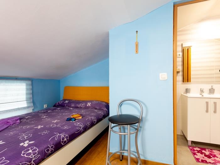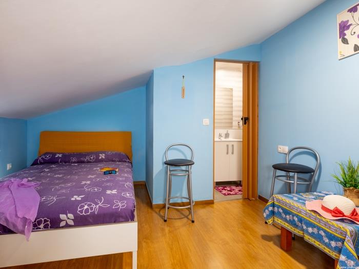 Subiendo las escaleras, llegas a la planta superior donde se encuentra un dormitorio. Este espacio íntimo tiene una decoración en tonos azules, creando una atmósfera tranquila para un descanso reparador, con una cama doble es amplia y cómoda, un baño en suite con ducha. Las ventanas ofrecen abundante luz natural durante el día.